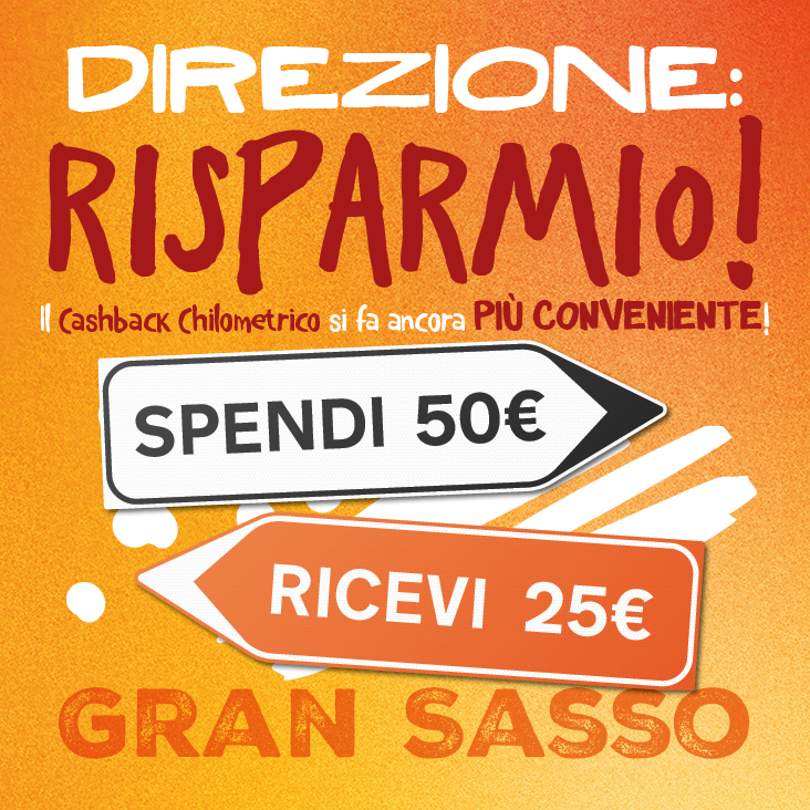 Al Centro Commerciale Gran Sasso ti aspetta l’iniziativa promozionale CASHBACK CHILOMETRICO che ti permetterà di ottenere un carnet di buoni shopping fino ad un valore di 25 €